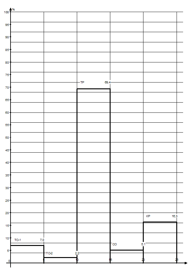 Отношение трудоёмкостей отдельных видов ТО и Р к общей трудоёмкости в % :
