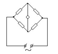 электропроводности при бесконечном разведении Кольрауш нашел, что в области малых концентраций молярная электропроводность сильного электролита изменяется с концентрацией по эмпирическому уравнению закон квадратного корня (А – эмпирическая константа). При несколько более высоких концентрациях сильных электролитов лучшее согласие с опытом дает уравнение закон кубического корня. Температурная зависимость молярной электропроводности для узкого интервала температур выражается уравнением: или, в более широком интервале: где λt, λt=0 – молярные электропроводности соответственно при температуре t и 0 ˚С; α и β – эмпирические коэффициенты. На электропроводность слабых и сильных электролитов влияет кроме температуры также давление, под которым находится раствор. Молярная электропроводность для большинства сильных электролитов при прогрессирующем увеличении давления вначале возрастает, достигает некоторого максимума, а затем вновь уменьшается, часто до значений более низких, чем те, которые наблюдаются при обычном давлении. Измерение электропроводности растворов Для измерения электрической проводимости раствора прибегают к измерению его сопротивления. Раствор помещают в специальный сосуд, имеющий два металлических электрода. Измерение может быть проведено как с помощью постоянного, так и с помощью переменного тока. Электропроводность электролитов обычно определяется при помощи мостовой схемы, используемой для измерения сопротивления проводника первого рода. В случае растворов электролитов применяются мосты, работающие на переменном токе, так как прохождение постоянного тока через растворы приводит к значительным ошибкам, связанным с явлениями электролиза и поляризации (изменение состава раствора вблизи электродов, изменение состояния электродов, наложение электродной поляризации на подаваемое напряжение). Необходимость применения переменного тока достаточно высокой частоты (для избежания указанных ошибок) усложняет измерительную схему. Изменение направления тока служит оптимальным средством для устранения поляризационного сопротивления. Кроме моста она содержит генератор переменного тока, а также специальные устройства для выпрямления тока перед прохождением его через нуль-инструмент и для компенсации емкостных эффектов.