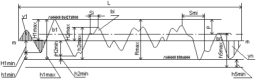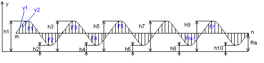 средним арифметическим отклонением профиля Rа называется среднее арифметическое расстояний (Y1,Y2,Y3,...,Yn) точек измеренного профиля до его средней линии m-m (рис.). Средняя линия m-m делит измеренный профиль таким образом, что в пределах базовой длины L сумма квадратов расстояний (Y1,Y2,Y3,...,Yn) точек профиля до этой линии минимальна. При определении положения средней линии допускается следующее условие: в пределах базовой длины L площади по обеим сторонам линии m-m до линии профиля равны между собой F1+F3+...+Fn-1=F2+F4+...+Fn Среднее арифметическое отклонения профиля Rа до средний линии суммируется без учета алгебраического знака n Rа=(еYi)/n i=1 Высота неровностей Rz - это среднее расстояние между находящимися в пределах базовой длины L пятью высшими точками выступов и пятью низшими точками впадин, измеренное от линии, || -ой средней линии m-m (рис.). Rz=(h1+h3+...+h9)+(h2+h4+...+h10) 5