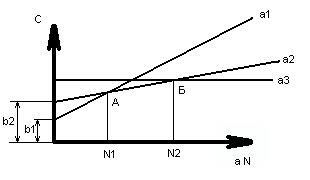 При выборе технологического варианта изготовления, часто приходится считаться с возможностью больших единовременных затрат b, если им соответствуют меньшие текущие затраты (см. график). Из графика следует, что прямая а1 пересекает прямую а2 в точке А, которая определяет величину партии, при которой вариант а1 можно экономично использовать. С увеличением годовой программы экономически более эффективным становится вариант а2. Решение задачи выбора наивыгоднейшего технологического варианта сводится в конечном счете к определению величины партии, при которой себестоимость двух сравниваемых вариантов становится равноценной. Такую критическую величину партии можно определить из условия: C'Nгод = C''Nгод или a1 * Nгод + b1 = a2 * Nгод + b2 откуда Nгод критич. = (b2-b1)/(a1-a2 ) Общая характеристика методов производства и удельный вес отдельных методов. Существует большое количество методов изготовления деталей и приборов в целом. Наиболее часто применяемыми в приборостроении являются: