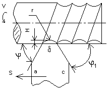 АВ - главное режущее лезвие. ВС - вспомогательное режущее лезвие. Режущие кромки сопряжены радиусом r. Высота микронеровностей H связана с шагом подачи S. Углы и 1 в значительной степени влияют на микронеровности. С увеличением и 1 высота микронеровностей увеличивается, с уменьшением - уменьшается. Величины и 1 влияют на силы резания. Чем меньше и 1, тем больше силы резания и наоборот. В свою очередь силы резания также влияют на микронеровности, т.к. при различных силах заготовка получает различный прогиб. При необходимости получения точением минимальных микронеровностей нужно стремиться к тому, чтобы 0. Припуск на обработку в этом случае должен быть минимальным.