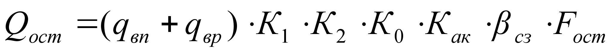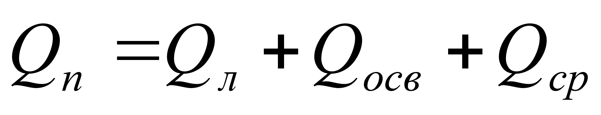 На основании расчета принимаем максимальное значение теплопоступлений за счет солнечной радиации, равное Qср=11729 Вт в период с 16 до 17 часов. Общее теплопоступление определяем по формуле: