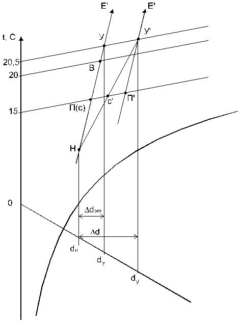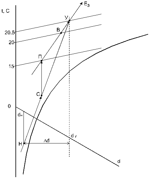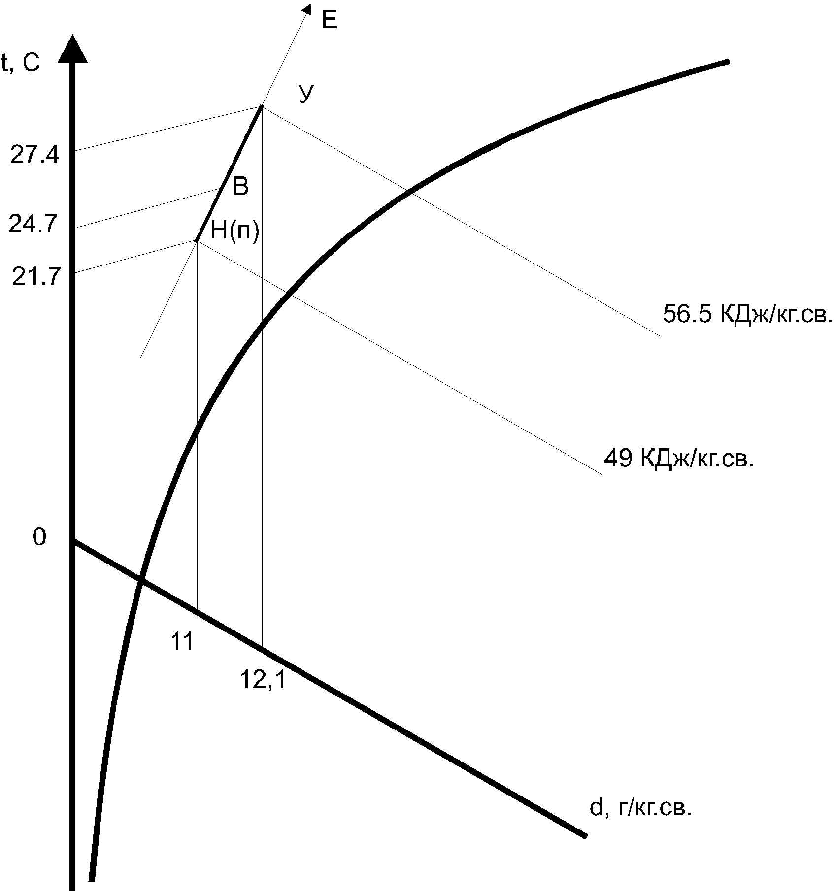 В переходный период предусмотрена рециркуляция воздуха. По параметрам наружного воздуха (tН=8С, IН=22,5 кДж/кг.св) строим точку Н (рис.2). Для построения точки У находим расчетное приращение влагосодержания воздуха: