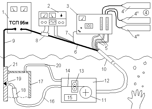 4. 4. полуавтоматическая сваркаПерспективной является полуавтоматическая сварка, сочетающая механическую подачу проволоки в зону дуги с маневренностью и универсальностью ручной сварки (рис.4.4). Кроме того, механическая подача проволоки позволяет длительное время вести процесс сварки без перерывов. Так как проволока имеет меньший диаметр, чем электрод, и не имеет покрытия, создаются благоприятные условия для наблюдения процесса управления формированием шва. Создание мокрого способа полуавтоматической сварки было связано с большими трудностями. Проведенные предварительные опыты показали, что швы получаются узкими, высокими, с неудовлетворительным качеством поверхности. Кроме того, в швах было обнаружено значительное количество пор и неметаллических включений. Механические свойства этих швов оказались недопустимо низкими. Использование для защиты дуги аргона и особенно углекислого газа позволяет не значительно понизить содержание водорода в металле шва. Для механизированной подводной сварки и резки разработаны и применяются полуавтоматы типа ППСР–300–2, "НЕПТУН". Полуавтоматом ППСР – 300 – 2 (рис. 4.4) можно сваривать сталь толщиной 4 мм и более, резать сталь толщиной до 25 мм на глубине до 60 м. В качестве защиты используют углекислый газ. Полуавтомат рассчитан на номинальную силу тока 300 А. Скорость подачи сварочной проволоки диаметром 1,2 или 1,6 мм регулируется в пределах 6,6 – 21,6 см/с. При зарядке кассеты проволокой в количестве 4 – 5 кг сварщик может непрерывно работать 2 – 2,5 ч. 4. 5. Сварочные материалыДля ручной дуговой сварки под водой используют электроды диаметром 4-6 мм (рис.4.1) из сварочной проволоки марок Св-08, Св-08А, Св-08ГА, Св-08Г2, а для полуавтоматической сварки – проволоки марок СВ-08Г2С, ППС-АН1. Наибольшее применение получили электроды марок ЭПС-5 и ЭПС-52, имеющие в составе покрытия ферросплавы, что улучшает химический состав и механические свойства металла шва. Водонепроницаемость покрытия достигается пропиткой такими составами, как парафин, раствор целлулоида в ацетоне, раствор синтетических смол в дихлорэтане, нитролаке и др. Для подводной сварки применяют специальные электрододержатели, которые имеют надежную электроизоляцию по всей поверхности. Смена электрода производится только после отключения сварочного тока.