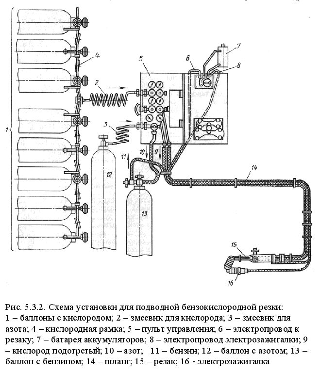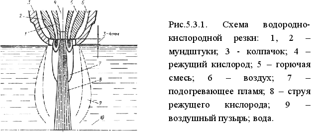 5.3. ГАЗОКИСЛОРОДНАЯ РЕЗКА Газокислородная резка основана на сгорании металла в струе кислорода и выдувании окислов и металла из полости реза. Она возможна только при постоянном существовании газового пузыря вокруг подогревающего пламени (рис. 3.3). Создание газового пузыря возможно за счет продуктов сгорания подогревающего пламени, для которого используют ацетилен, водород, другие углеводороды и бензин. Устойчивость пузыря обеспечивается специальной конструкцией наконечника подводного резака и подачей защитного газа – воздуха или кислорода. В воде металл интенсивно охлаждается и поэтому для его подогрева требуется пламя в 10-15 раз больше, чем для аналогичных работ на воздухе. Водород и кислород поступают по шлангам из баллонов, а воздух по отдельному шлангу от компрессора или баллона. На глубине 30-40 м водородно-кислородным резаком можно резать сталь толщиной до 70 мм; рабочее давление газов составляет, кгс/см2: 6,6 – кислород, 5,5 – водород, 5 – воздух. Средний часовой расход водорода и кислорода 4-10 м3, воздуха 20 м3. Использование бензина для подводных работ стало возможным благодаря разработке новых конструктивных принципов построения бензорезов, сущность которых состоит в том, что бензин предварительно не испаряется, а распыляется кислородом и в зону подогревательного пламени подается в виде тончайшей бензиновой пыли. Продукты сгорания пламени содержат много неконденсирующихся газов, образующих устойчивый газовый пузырь, что исключает подведения дополнительного воздуха или кислорода, упрощает и удешевляет установку и ее эксплуатацию. Ацетилен в качестве горючего газа применяется редко, т.к. ацетилен под давлением является сильно выраженным эндотермическим продуктом и на глубине 5-15 м, разлагается на составляющие – углерод и водород. Газокислородную резку чаще всего применяют для разрезания сталей и материалов, которые легко окисляются. Применять газокислородную в чистом виде для цветных металлов и сталей, устойчивых к действию коррозии, невозможно. Для газокислородной резки требуется более высокая квалификация резчиков, чем для электрокислородной резки, но оборудование проще и компактнее