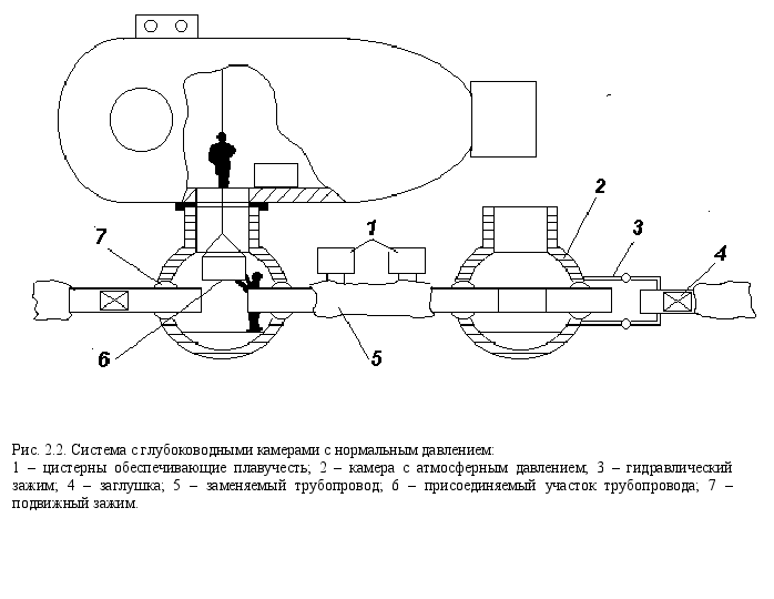 Поскольку время пребывания на дне ограничено, а обычный промежуток между погружениями составляет 2 ч, представляется целесообразным для осуществления всех водолазных работ, за исключением кратковременных осмотров, использовать метод погружения, при котором ткани тела водолаза, работающего под водой, насыщается инертным газом. Скорость насыщения зависит в основном от глубины погружения и времени нахождения под водой. Время декомпрессии зависит от количества растворенного газа. С наступлением состояния насыщения время декомпрессии становится постоянным и зависит от дальнейшей экспозиции. Это явление позволяет осуществлять подъем водолазов после погружения в колоколе, в котором сохраняется давление, равное глубине погружения, до тех пор, пока водолазы не перейдут в декомпрессионную камеру на палубе, в которой поддерживается такое же давление. Таким образом, удается избежать декомпрессии между отдельными погружениями и предоставить отдых водолазам. Метод длительного пребывания позволяет водолазам проводить на глубине более длительный период, а время декомпрессии при этом не увеличивается. Недостаток этого метода – использование дополнительного оборудования и привлечение дополнительного обслуживающего персонала, что ведет к большим затратам материальных средств. Кроме водолазного колокола может быть использован погружаемый аппарат с выходом водолаза через шлюзовое устройство. На рис.2.2 представлен общий вид системы с использованием сварочно-монтажных камер с нормальным атмосферным давлением. П Доставка персонала осуществляется сухим способом в камере с атмосферным давлением. Применение глубоководной водолазной техники уже оправдало себя на глубине до 200 м, в настоящее время возможно погружение на глубину до 300 м. Пока ни одно приспособление не может заменить мастерство водолазов и их способность двигаться в ограниченных пространствах в районе свариваемого соединения. Однако на глубине 600 м возникает физиологический и медицинский барьер, не позволяющий дальнейшее погружение. На глубинах от 300 до 600 м погружение водолазов следует рассматривать лишь как крайнюю необходимость, а работы на глубинах свыше 600 м должны осуществляться посредством дистанционно управляемых рабочих комплексов, а также подводных аппаратов с нормальным давлением. 3. сухая глубоководная (гидросварка) Для осуществления гидросварки необходимо обеспечить локализованную стабильную сухую газовую среду вокруг свариваемого соединения и сварочной головки при помощи изготовленных по особому заказу камер или при помощи легких портативных боксов. В обоих случаях непрерывная полуавтоматическая сварка электродной проволокой осуществляется в сухой среде. Закрепляемое на месте сварки заграждение, называемое гидробоксом, изготавливают частично или полностью из прозрачного материала. Бокс должен плотно прилегать к свариваемому соединению и обеспечивать герметичность. Основание бокса делается открытым для возможности ввода в нее водолазом-сварщиком сварочной головки. Для вытеснения из бокса воды и создания сухой среды в него подается смесь инертных газов под соответствующим давлением. Через прозрачные стенки бокса сварщик может наблюдать за дугой и сварочной ванной. Гидробокс обычно изготовляют по специальному заказу, при необ