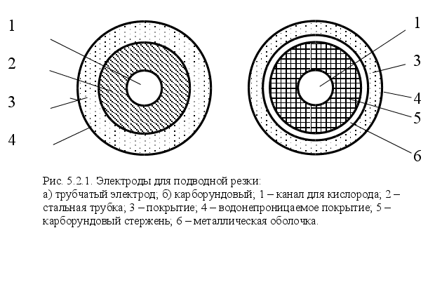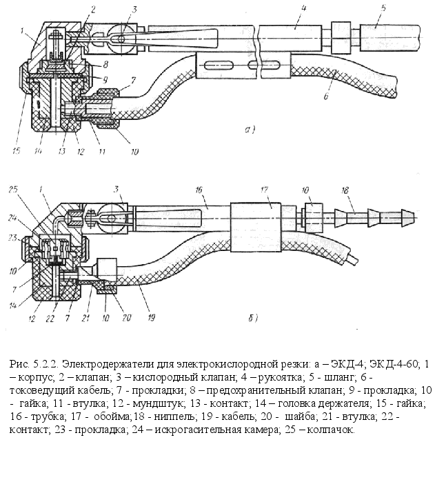5.2. электрокислородная резка Электрокислородная резка впервые применена в 1915г и в настоящее время является самой распространенной. Способ электрокислородной резки удачно объединил преимущество дугового разряда и струи режущего кислорода. За счет тепла дуги происходит нагрев и плавление металла, а за счет струи кислорода – сгорание и выдувание металла из полости реза. В основном применяют трубчатые электроды с осевым каналом для режущего кислорода и специальные электроды из карборунда. Стержни электродов изготовляют из толстостенной цельнотянутой трубки из малоуглеродистой стали наружным диаметром 5 – 7 мм и внутренним 1,5 – 2 мм (см. рис. 5.2.1). Длина электродов 350 – 400 мм. Трубчатый электрод покрывают обмазкой толщиной 1 – 1,2 мм. Время сгорания такого электрода 1 мин. Электроды из карборунда получили название керамических (рис. 5.2.1). Керамический электрод из карборунда длиной 250 мм сгорает через 15 мин. Однако из-за больших размеров (диаметр 15 – 20 мм) керамические электроды могут быть рекомендованы для резки сплошного металла толщиной до 30 мм. Для электрокислородной резки применяют электродержатели специальной конструкции типа ЭКД4 и ЭКД4 – 60 (рис. 5.2.2). Показатели электрокислородной резки Таблица 5.2