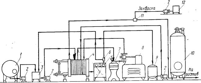 Мал. 2. Схема технологічної лінії виробництва кисломолочних напоїв резервуарним засобом: 1- ємність для сирого молока; 2 - насоси; 3 - балансировочний бачок: 4-пластинчаста пастерізаційно-охолоджувальна установка; 5 - пульт керування; 6 - поворотний клапан; 7 - сепаратор-нормалізатор; 8 - гомогенізатор; 9 - ємність для витримування молока; 10 - ємність для кисломолочних напоїв; Л - змішувач; 12 – заквасочник. Кефір, що виготовляється із дозріванням, після сквашування охолоджується до 14-16 °С і при цій температурі дозріває. Тривалість дозрівання кефіру не менше 10-12 год. Під час дозрівання активізуються дріжджі, відбувається процес спиртового бродіння, у результаті чого в продукті накопичуються спирт, вуглекислота й інші речовини, які надають цьому продукту специфічні властивості. Технологічна лінія виробництва кисломолочних напоїв резервуарним засобом подана на мал. 2. Молоко з ємності для сирого молока подається в балансировочний бачок, звідки направляється в рекуперативну секцію пастеризаційно-охолоджувальної установки, де підігрівається до 55-57 °С. Для пастеризації молока використовуються пастеризаційно-охолоджувальні установки для кисломолочних продуктів, у яких можна проводити пастеризацію з необхідною витримкою і наступним охолодженням до температури сквашування. Підігріте молоко направляється спочатку в сепаратор-нормалізатор, а потім - на гомогенізатор. Для гомогенізації призначені гомогенізатори клапанного типу. З гомогенізатора молоко спочатку надходить у секцію пастеризації, далі через пульт керування — у ємність для витримування і повертається в рекуперативну секцію і у секцію охолодження пастеризаційно-охолоджувальної установки, де охолоджується до температури заквашування. Якщо по виході із секції пастеризації молоко не досягло заданої температури, то воно за допомогою поворотного клапану направляється в балансировочний бачок для повторної пастеризації. Охолоджене молоко надходить у ємність для виробництва кисломолочних напоїв, перемішуючись у змішувачі з закваскою. Сквашування молока проводять у спеціальних двустінних вертикальних ємностях, обладнаних мішалками з автоматичним пристроєм. Мішалка обладнана таким чином, щоб не збовтувати кефір і не різати його на шари і кубики, а рівномірно й одночасно перемішувати всю масу кефіру. Часткове перемішування або розрізка згустку призводить до відділення сироватки, а збовтування мішалкою — до піноутворення, що у свою чергу викликає відділення сироватки. Автоматичний пристрій забезпечує протікання сквашування по визначеному циклі: перемішування - спокій - перемішування, а також служить для вмикання системи охолодження. Охолодження здійснюють холодною водою або розсолом, що циркулює по кільцевому зазорі між внутрішньою і середньою ємностями. Середня ємність постачена теплоізоляцією, облицьованої захисним кожухом. Для виробітки кисломолочних продуктів використовуються ємності місткістю 2000, 4000, 6000 і 10000 л. Заквашене молоко сквашується в ємності до необхідної кислотності. Отриманий згусток охолоджується в тій же ємності, при цьому через кожні 30-40 хв. включається мішалка для розмішування згустку і більш швидкого його охолодження. Якщо потрібно дозрівання, то згусток охолоджується до температури дозрівання й залишається в ємності на дозрівання. Охоло