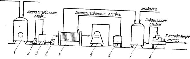 Мал. 3. Схема технологічної лінії виробництва сметани резервуарним методом: 1 - ємність для вершків: 2 - насос; 3 - зрівняльний бак; 4-пластинчаста пастеризаційна-охолоджувальна установка; 5 - гомогенізатор; 6 - витримувач; 7 - ємність для виробітки кисломолочних продуктів; 8 - автомат для фасування. Ступінь тужавіння гліцеридів залежить від температури охолодження і тривалості витримки: із зниженням температури кількість отверділого молочного жиру в сметані збільшується. При 2- 8 °С воно складає 35-50 %. Після дозрівання продукт готовий до реалізації. Технологічний процес виробництва сметани резервуарним засобом здійснюється на лінії (мал. 61). Отримані вершки направляються в ємність, у якій проводять нормалізацію суцільним або знежиреним молоком. Потім вершки пастеризуються на пластинчастій пастеризаційній-охолоджувальній установці для вершків або на трубчастій пастеризаційній установці і направляються на гомогенізацію, що здійснюється в гомогенізаторах клапанного типу. Пастеризовані вершки витримуються у витримувачі, прохолоджуються на пастеризаційній-охолоджувальній установці, направляються на Сквашування. Для сквашування вершків використовують ємності для виробітки кисломолочних продуктів. Для подачі поквашених вершків на фасування призначені поршневі, мембранні, гвинтові, ротаційні і шестеренні насоси. Фасування поквашених вершків здійснюється на автоматах я напівавтоматах, розрахованих на дозування грузлих молочних продуктів. ТЕХНОЛОГІЧНИЙ ПРОЦЕС ВИРОБНИЦТВА СИРІВ Виробництво сиру здійснюють традиційним засобом і засобом із застосуванням ультрафільтрації. Традиційний засіб. У основу цього засобу призначений принцип концентрування складових частин молока, головним чином вивірки і жиру, шляхом відділення сироватки від молочного згустку, отриманого в результаті сичугової або кислотно-сичугової коагуляції. Сироватка, що виділяється містить молочний цукор, сироваткові вивірки, жир і мінеральної солі. Основною хибою традиційного засобу виробництва є трудність регулювання вологості і кислотності продукту, оскільки ці показники залежать від цілого ряду чинників. Одержання значної кількості сироватки призводить до зниження виходу готового продукту, тому що в сироватку переходить частина білків і жиру вихідної сировини. Технологічний процес виробництва натуральних сирів традиційним засобом включає такі операції: приймання молока; проміжне збереження; підігрівши; очищення і нормалізацію; пастеризацію; охолодження і дозрівання; підігрівши молока; внесення закваски, хлористого кальцію і сичугового ферменту; згортання молока; опрацювання згустку; формування сиру; самопресування і пресування сиру; його соління і дозрівання. Загальними операціями у виробництві всіх груп сирів є технологічні операції по підготуванню молока до згортання. Деякі особливості мають місце тільки при нормалізації, пастеризації і дозріванні молока. Ціль нормалізації молока в сироварінні полягає в одержанні визначеного співвідношення між жиром і сухим залишком сиру, що називається жирністю сиру в сухій речовині. Така жирність прийнята за стандартний розмір, тому що в процесі дозрівання сиру не змінюється. Утримання жиру в сухій речовині сиру залежить в основному від співвідношення жиру і вивірки в нормалізованої суміші, ступ