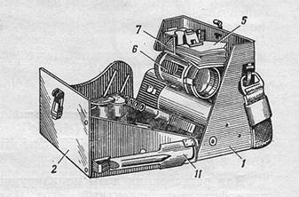 ВПХР: 3 - ручной насос; 4 - кассеты с индикаторными трубками; 8 - электрофонарь; 9 - грелка; 10 - патроны к грелке; 12 - инструкция-памятка по работе с прибором; 13 - инструкция по обнаружению фосфороорганических ОВ; 14 - плечевой ремень.