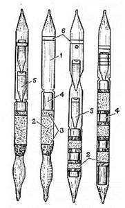 ИНДИКАТОРНЫЕ ТРУБКИ : 1 - корпус трубки; 2 - наполнитель; 3 - ватный тампон; 4 - обтекатель; 5 - ампулы с индикатором; 6 - маркировочное кольцо.