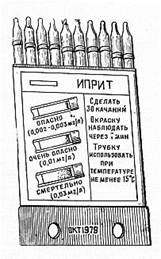 ИНДИКАТОРНЫЕ ТРУБКИ, имеющие одинаковую маркировку, укладываются в кассеты по 10 штук. На лицевой стороне кассеты наклеена этикетка с изображением окраски. возникающей на наполнителе трубки при наличии в воздухе ОВ, и указан порядок работы с данной трубкой. В комплект прибора ВПХР входят три комплекта индикаторных трубок. Устройство ВПХР. Прибор состоит из корпуса с крышкой и размещенных в них: ручного насоса, насадки к насосу, бумажных кассет с индикаторными трубками, защитных колпачков, противодымных фильтров, электрофонаря, грелки с патронами. Кроме того, в комплект прибора входит лопатка для взятия проб, штырь, “Инструкция по эксплуатации”, памятка по работе с прибором, памятка по определению ОВ типа зоман в воздухе, плечевой ремень с тесьмой. Масса прибора — 2,3 кг, чувствительность к фосфорорганическим ОВ — до 5-10-6 мг/л, к фосгену, синильной кислоте и хлорциану — до 5-10-3 мг/л, иприту — до 2*10-3 мг/л; диапазон рабочих температур от —40 до +40°С. Ручной насос (поршневой) служит для прокачивания зараженного воздуха через индикаторную трубку, которую устанавливают для этого в гнездо головки насоса. При 50—60 качаниях насосом в 1 мин через индикаторную трубку проходит около 2 л воздуха. На головке насоса размещены нож для надреза и два углубления для обламывания концов индикаторных трубок; в ручке насоса — ампуловскрыватели. Насадка к насосу является приспособлением, позволяющим увеличивать количество паров ОВ, проходящих через индикаторную трубку, при определении ОВ на почве и различных предметах, в сыпучих материалах, а также обнаруживать ОВ в дыму и брать пробы дыма. Индикаторные трубки, расположенные в кассетах ,предназначены для определения ОВ и представляют собой запаянные стеклянные трубки, внутри которых помещены наполнитель и ампулы с реактивами. Индикаторные трубки маркированы цветными кольцами и уложены в бумажные кассеты по 10 шт. На лицевой стороне кассеты дан цветной эталон окраски и указан порядок работы с трубками. Для определения ОВ типа Си-Эс и Би-Зет предназначены трубки ИТ-46. В комплект ВПХР они не входят и поставляются отдельно. Защитные колпачки служат для предохранения внутренней поверхности воронки насадки от заражения каплями ОВ и для помещения проб почвы и сыпучих материалов при определении в них ОВ. Противодымные фильтры применяют для определения ОВ в дыму, малых количеств ОВ в почве и сыпучих материалах, а также при взятии проб дыма. Они состоят из одного слоя фильтрующего материала (картона) и нескольких слоев капроновой ткани. Грелка служит для подогрева индикаторных трубок при пониженной температуре окружающего воздуха от –40 до +10°С. Она состоит из пластмассового корпуса с двумя проушинами, в которые вставляется штырь для прокола патрона, обеспечивающего нагревание. Внутри корпуса грелки имеется четыре металлические трубки: три — малого диаметра для индикаторных трубок и одна — большого диаметра для патрона. Полуавтоматический прибор химической разведки (ППХР). Предназначен для решения тех же задач, что и ВПХР. Принцип его работы аналогичен принципу работы ВПХР. Отличие состоит в том, что воздух через индикаторные трубки прокачивается с помощью ротационного насоса, работающего от электродвигателя постоянного тока, а при низких температурах трубки подогреваются с помощью электрогрелки. Пи