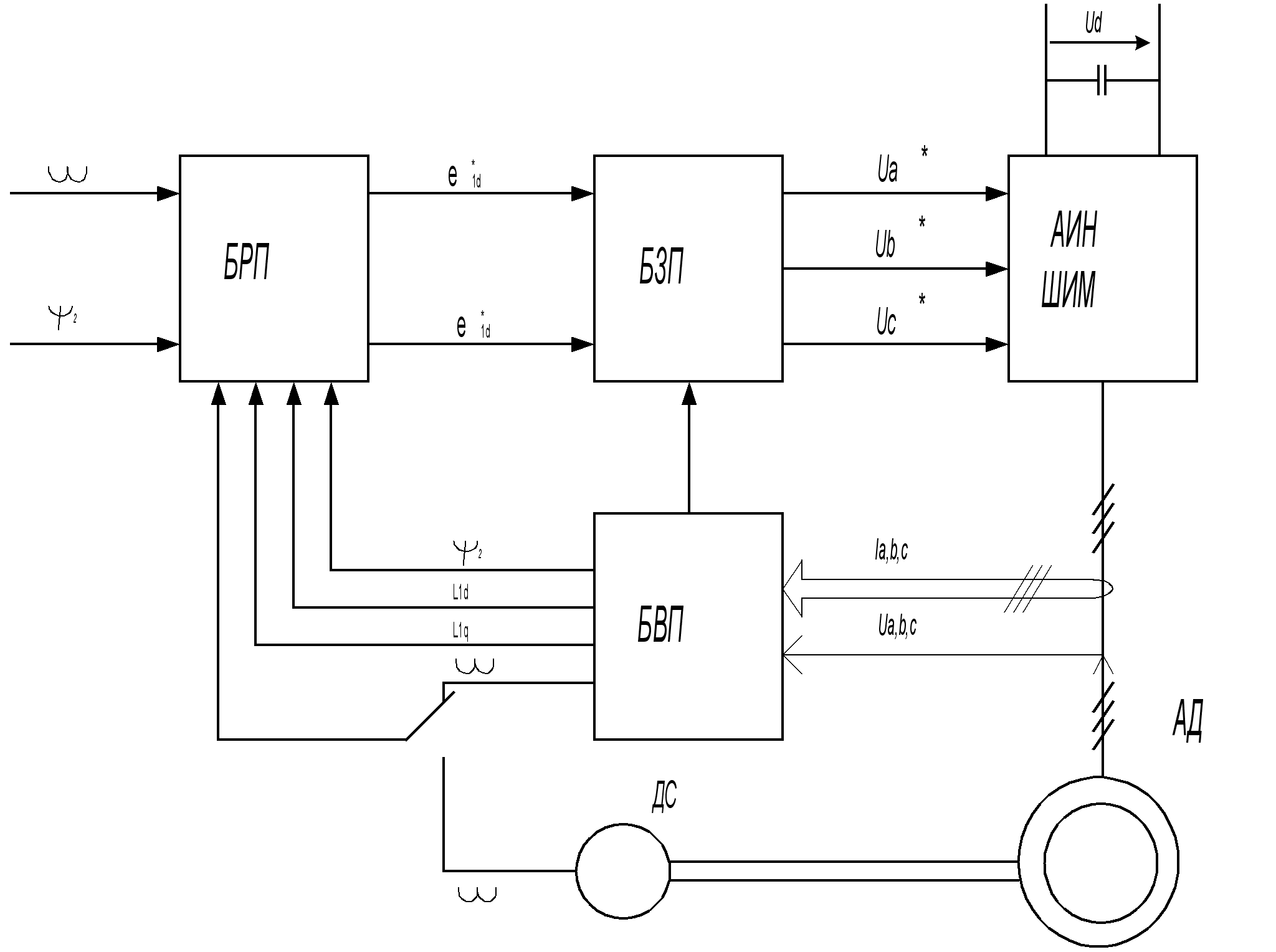 БЗП осуществляет фазовые и координатные преобразования задающих d – q переменных в систему трехфазных сигналов управления ШИМ АИН. Блок БВП вычисляет текущие значения амплитудных и фазовых параметров d – q переменных АД, осуществляя фазовые и координатные преобразования реальных трёхфазных сигналов токов и напряжений АД, поступающих с выходов соответствующих датчиков. Координатные преобразования, осуществляемые блоком БВП, заключаются в переходе от реальных координат трёхфазной системы статора АД с осями d,q (преобразование 3 → 2). Блок БЗП осуществляет обратные координатные преобразования (2 → 3), от d-q к a,b,c. Фазовые преобразования в этих блоках обеспечивают привязку фазовых параметров переменных в двух системах координат. На надежность, стоимость и качество характеристик ЭП влияют число измеряемых параметров и точность измерений. Для векторного управления АД надо измерять хотя бы две из четырех, доступных к измерению переменных: