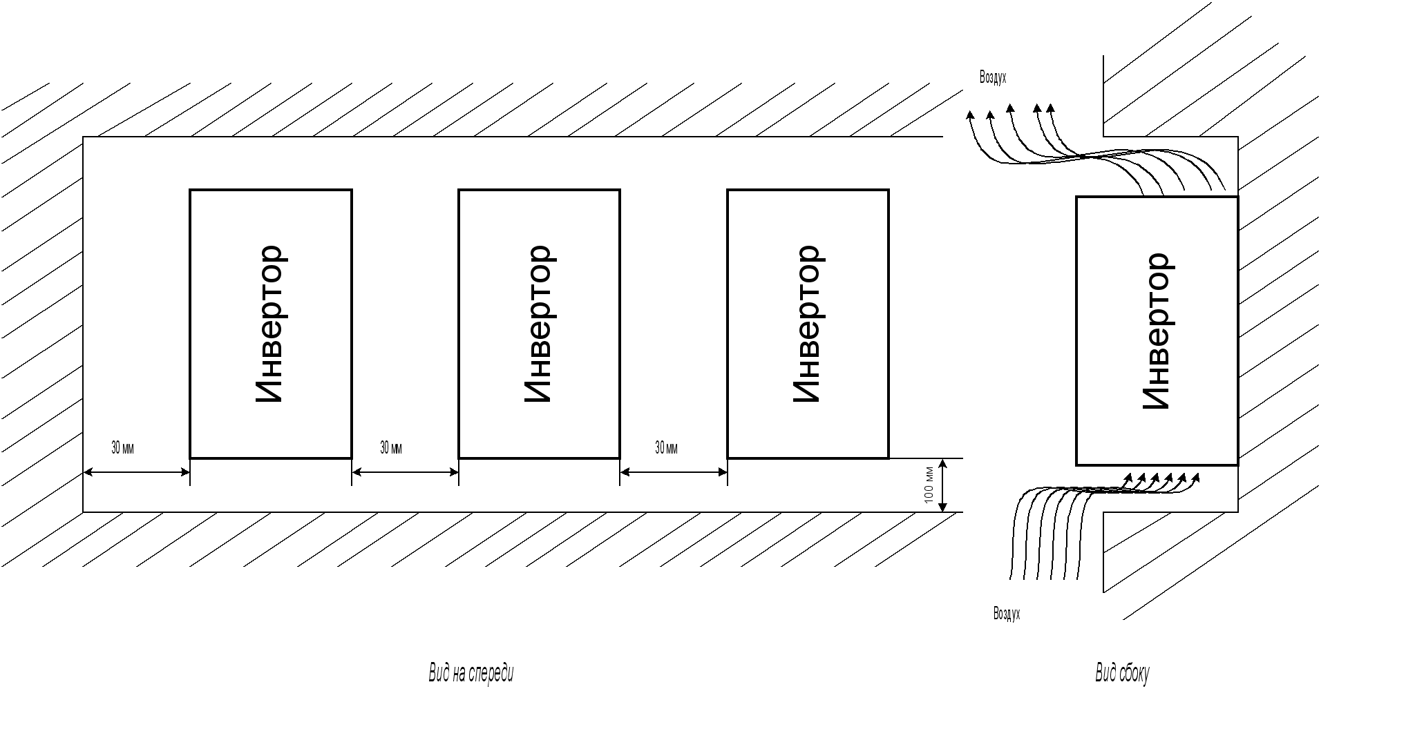 3.1.2 Монтаж АИН “OMRON 3G3EV” а) Инвертор “ OMRON 3G3EV” крепится к вертикальной панели двумя винтами M4. б) Параметры окружающей среды и места для установки. температура воздуха - 1050 0С; влажность не более 90% (без конденсации); инвертор надо располагать в чистом месте, свободном от масляных брызг и пыли. Или же полностью закрывать его, не допускать попадания пыли и брызг внутрь; При установке инвертора обратите особое внимание на недопустимость воздействия на прибор металлической пыли, масла, воды и т. д.; Инвертор нельзя устанавливать на горючих материалах; в) Пространство для монтажа Для нормального охлаждения при монтаже необходимо выдерживать минимальные расстояния, как показано на рисунке 10.