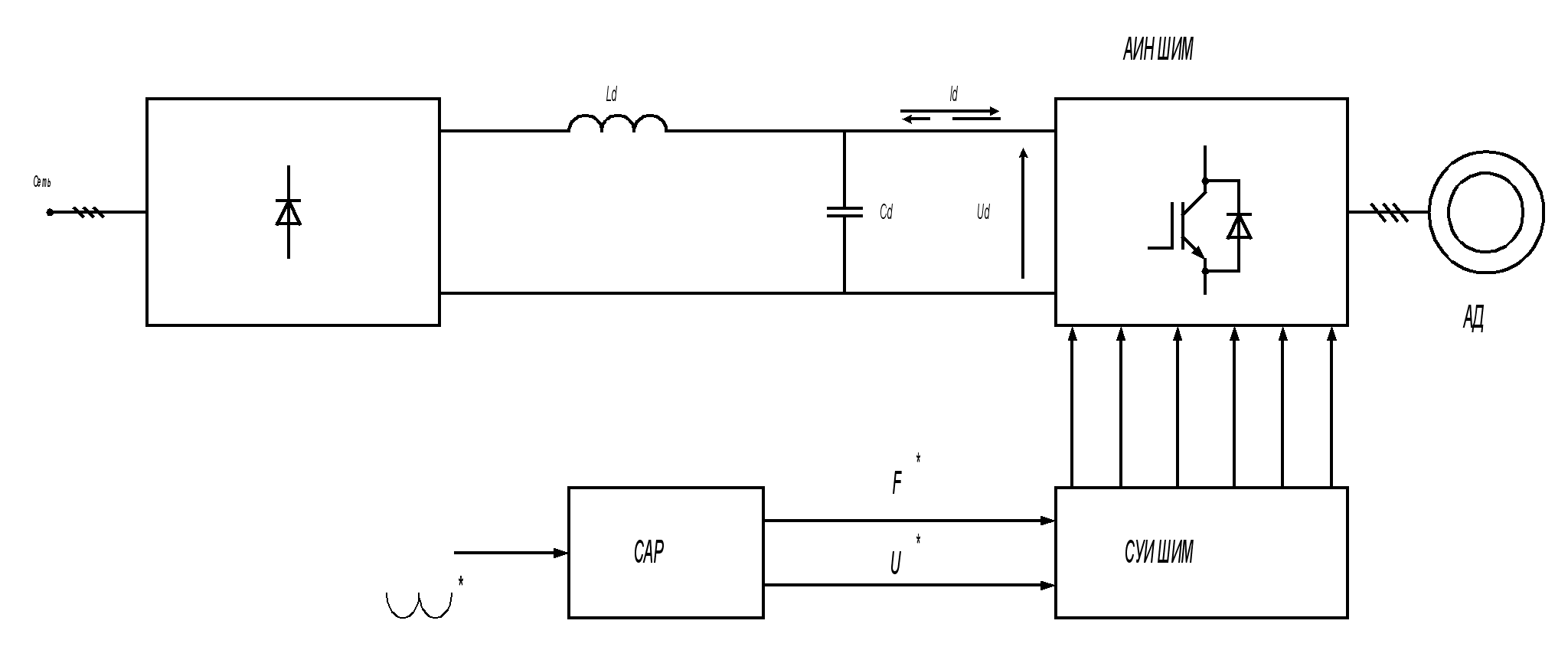 В – выпрямитель; Ld – дроссель фильтра Ф (см. рисунок 3); Id – активная составляющая тока фильтра; Cd – ёмкость фильтра; Ud – напряжение фильтра; ω* - задание на входе инвертора; F* , U*- частота и значение выходного напряжения соответственно, согласно V/f – характеристике; САР – система автоматического регулирования; СУИ ШИМ – система управления широтно-импульсной модуляцией; АИН ШИМ – автономный инвертор напряжения с широтно-импульсной модуляцией. Рисунок 2 – Упрощённая функциональная схема АИН.