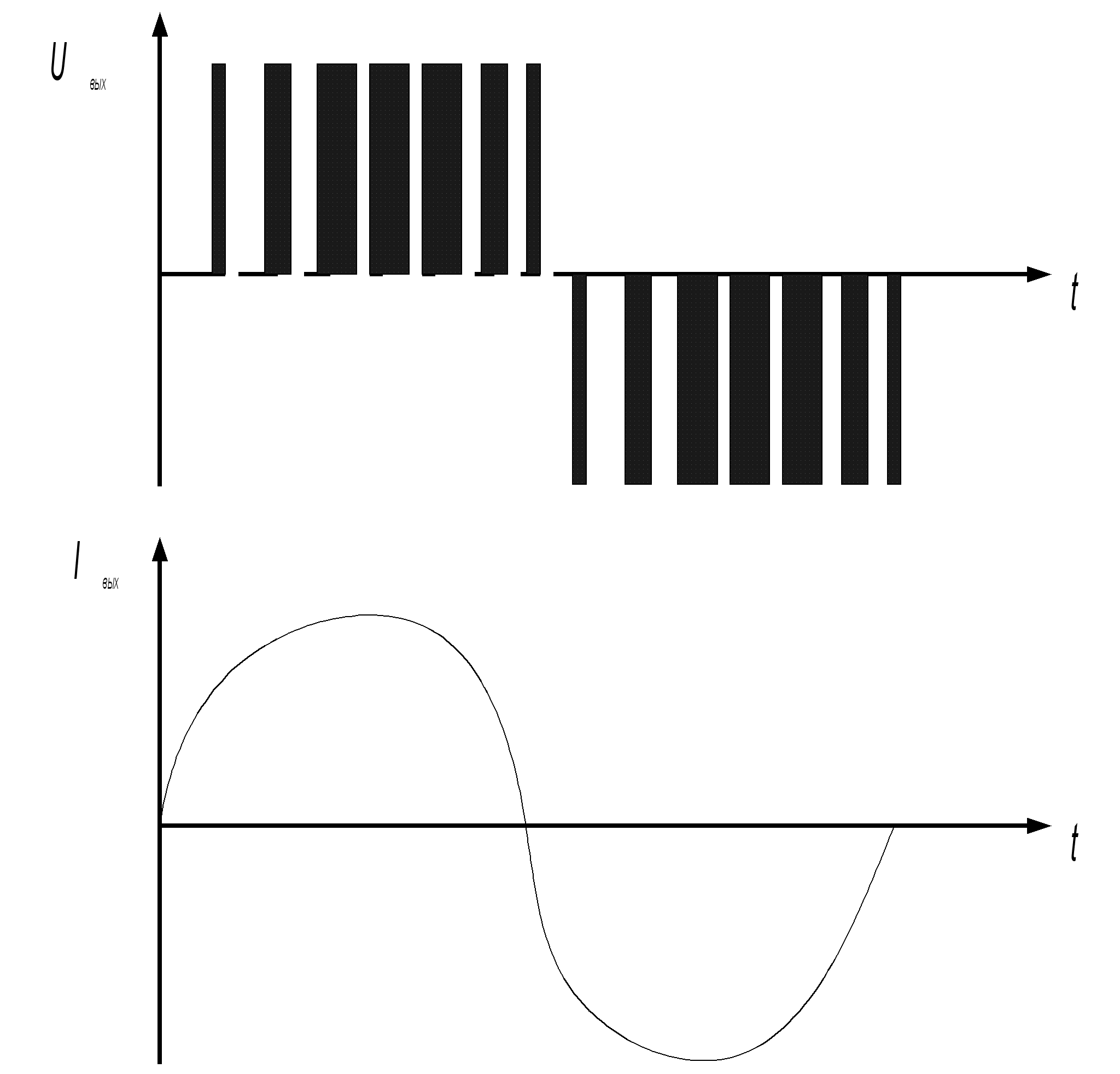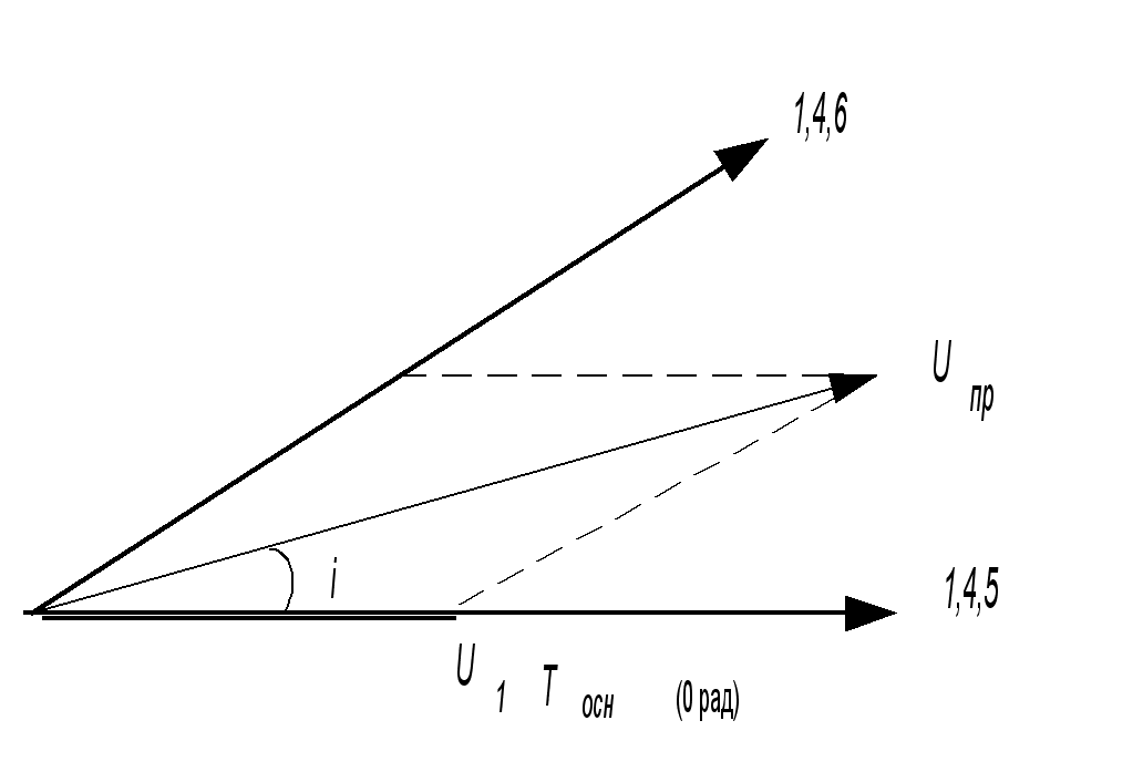 Uпр – промежуточный вектор; U1 – проекция промежуточного вектора на основной; i – угол промежуточного вектора. Рисунок 7 – Промежуточный вектор в системе базовых. АИН обладает характеристиками источника напряжения, его выходным регулируемым параметром является напряжение на зажимах АД. Современные АИН выполняются на основе полностью управляемых силовых полупроводниковых приборов - запираемых GTO-тиристоров, либо биполярных IGBT-транзисторов с изолированным затвором. Рассмотрим 3-х фазную мостовую схему (смотри рисунок 3). Классификационные признаки схемы – наличие ёмкостного входного фильтра Cd и включенных встречно-параллельно управляемым ключам V1 – V6 диодов обратного тока Д1 – Д6. За счёт поочередного переключения вентилей V1 – V6, постоянное входное напряжение Ud преобразуется в переменное прямоугольно-импульсное выходное напряжение. Регулирование выходного напряжения АИН можно осуществлять двумя способами: амплитудным (АР) за счёт изменения величин входного напряжения Ud и широтно-импульсным (ШИМ) за счёт изменения программы переключения вентилей V1 – V6 при Ud - const. Через управляемые ключи V1 – V6 протекает активная составляющая тока АД, через диоды Д1 – Д6 – реактивная составляющая тока АД. Конденсатор фильтра является источником реактивной мощности, потребляемой АД, через него замыкается переменная составляющая входного тока инвертора. Специальный алгоритм ШИМ управления АИН осуществляет кроме регулирования также улучшение гармонического состава выходного напряжения, что обеспечивает высокую степень синусоидальности тока АД. ЭП на основе ПЧ на основе АИН ШИМ содержит неуправляемый диодный силовой выпрямитель В и АИН ШИМ (смотри рисунок 2). Регулирование гармоник f1 и величины выходного напряжения U1 осуществляется в АИН за счёт использования алгоритмов высокочастотного ШИМ-управления. Частота ШИМ обычно составляет от 2 до 12 кГц, т.е. на порядок превосходит выходную частоту АИН. Форма кривой выходного напряжения при этом представляет собой высокочастотную двухполярную последовательность прямоугольных импульсов (смотри рисунок 4). Частота импульсов определяется частотой ШИМ, длительность (ширина) импульсов в течение периода выходной частоты АИН промодулирована по синусоидальному закону. Форма кривой выходного тока – тока АД практически синусоидальна. К силовым ключам АИН ШИМ предъявляются требования высокого быстродействия и малых динамических потерь. В тормозном режиме ЭП АИН из режима инвертирования переводится в режим выпрямления (работает мост диодов обратного тока, через управляемые ключи подводится энергия возбуждения АД). Полярность напряжения на входе АИН сохраняется, а ток меняет своё направление. Поэтому для реализации тормозного режима приведенная схема ЭП должна быть дополнена силовыми элементами – либо обратным управляемым выпрямителем (работает в режиме зависимого сетевого инвертора) для регенерации энергии в сеть, либо управляемым ключом (блок БТ на рисунке 1) и тормозным резистором в цепи постоянного напряжения для осуществления электродинамического торможения. В режиме Ud = const регулирование значения и изменение формы выходного напряжения возможно только путем трансформирования вида коммутационной функции методами широтно-импульсного регулирования (ШИР) и широтно-импульсной моду