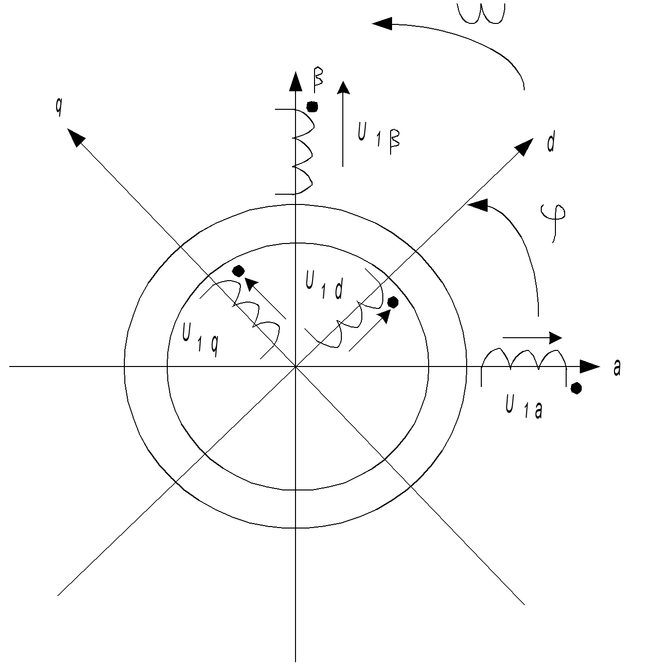 i=1a,…2q; j=1a,…2q, Ri – активное сопротивление обмотки, Li,j – собственные и взаимные индуктивности обмоток. Величина взаимных индуктивностей зависит от угла поворота ротора и от пространственного сдвига обмоток, т.е. является функцией скорости (и времени). Именно поэтому невозможно получить cos φ = 1. Синтез алгоритмов и систем векторного управления АД базируется на анализе двухфазной d – q модели АД (d и q – ортогональная система координат ротора).