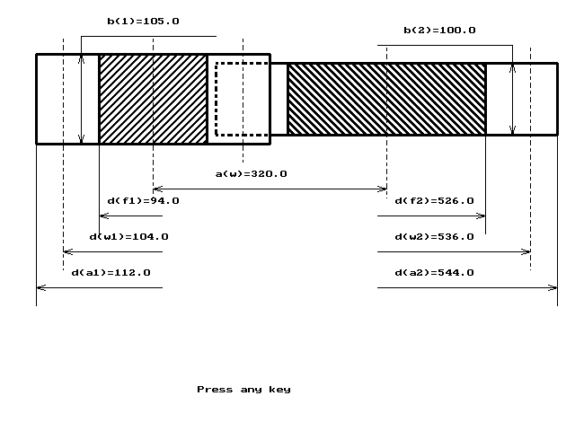 перегрузки Частота обращения ведущего вала n1 = 1480. Твердость по Бринелю матеріалa ведущему колесу HB1=241. Твердость по Бринелю матеріалa ведомому колесу HB2=200. Вид передачи : прямозубая. Расположение колес на вале : симметричное. ДН при расчете на КВ для ведущего колеса HP1 = 502, для ведомого колеса HP2 = 427. ДН при расчете на ВПИ для ведущего колеса FP1 = 173, для ведомого колеса FP2 = 144. Программа выдала такие данные: aw=320, bw=100 (почти верно). 2.2 Проектный геометрический расчет. Межосевое расстояние aw=320 гг .Ширина зацепления bw=100 гг .Модуль зацепления нормальный mn=4,00 гг . Числа зубьев : z1=26 , z2=134 . Угол наклона зубьев = 0 град. 0 мин. 0 сек. Начальные диаметры колес : dw1=104,0 гг , dw2=536,0 гг . Делительные диаметры колес : d1=104,0 гг , d2=536,0 гг . Диаметры выступлений колес : da1=112,0 гг ,da2=544,0 гг . Диаметры впадин колес : df1=94,0 гг ,df2=526,0 гг .