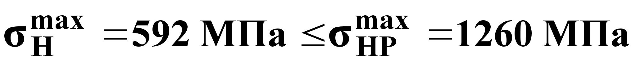 Недовантаження у межах рекомендованого з точки зору економічності. 3.2. Перевірка витривалості при згині при дії довгочасного навантаження Розрахункове напруження на перехідній поверхні : F1=112 МПа, F2=104 МПа, допустиме значення напруження згину FP1=173 МПа, FP2=144 МПа. F1=112 МПа < FP1=173 МПа, F2=104 МПа < FP2=144 МПа, витривалість при згині забезпечується. 3.3. Перевірка статистичної міцності при короткочасних перевантаженнях Діюче контактне напруження при перевантаженні