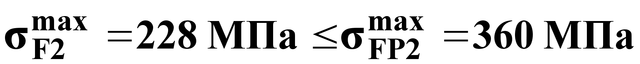Недогруженность в границах рекомендованной с точки зрения экономичности. 3.2. Проверка выносливости при сгибе при действии долговременной погрузки Расчетное напряжение на переходной поверхности : F1=112 МПа, F2=104 МПа, допустимое значение напряжения сгиба FP1=173 МПа, FP2=144 МПа. F1=112 МПа < FP1=173 МПа, F2=104 МПа < FP2=144 МПа, выносливость при сгибе обеспечивается. 3.3. Проверка статистической прочности при кратковременных перегрузках Действующее контактное напряжение при перегрузке