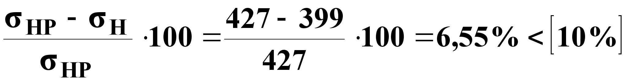 Получили частота обращения исходного вала в границах допустимого. Дополнительные сведения. Колова скорость = 8,059 м/с ,Коэффициенты перекрытия : торцового = 1,75 , осевого = 0,00 , Степень точности 7.3. ПРОВЕРОЧНЫЙ РАСЧЕТ 3.1. Проверка контактной выносливости при действии долговременной погрузки Расчетное напряжение H=399 МПа , допустимое напряжение HP=427 МПа . H=399 < HP=427 контактная выносливость обеспечивается.