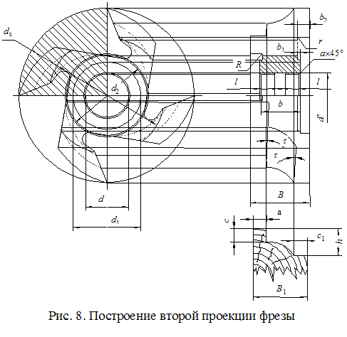 За счет косой обточки вертикальных кромок затылка профиль зубьев фрезы при переточках смещается вправо. Поэтому размер В следует больше сместить вправо относительно профиля детали. 15. Вычерчивают профиль зубьев фрезы на второй проекции, используя первую проекцию и профиль детали. При этом показывают разрез 1/4 фрезы. 16. Изображают контуры ступицы. Ширину ступицы b принимают в зависимости от ширины фрезы В:
