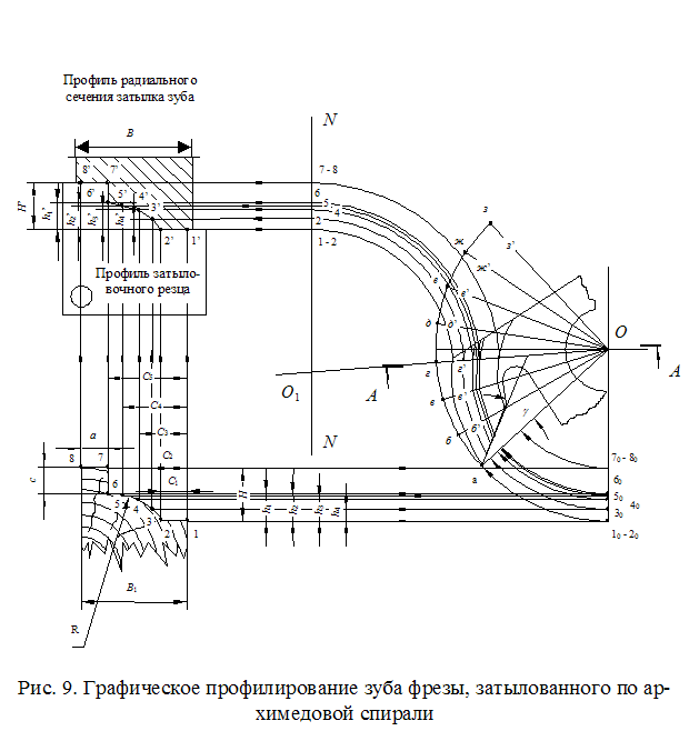 где х - коэффициент несимметричности. При х = 0...0,49 ступица смещена вправо, при х = 0,51...1,0 ступица смещена влево, при х = 0,5 ступица расположена симметрично. Углы выточки скругляют галтельно радиусом r = 1,5...2,0 мм. 19. Вертикальные линии зубьев выполняют с поднутрением или боковой обточкой затылка (см. анализ профиля детали). 20. При окончательном оформлении чертежа линии построения убирают, а видимые линии обводят. ПРОФИЛИРОВАНИЕ ЗАТЫЛКОВ ЗУБЬЕВ Профилирование затылка зуба есть процесс определения размеров профиля затылка в радиальном сечении по заданному профилю обрабатываемой детали. Различают два метода профилирования: графический и аналитический. Первый метод обладает хорошей наглядностью, но невысокой точностью, второй метод обеспечивает высокую точность, но не дает наглядности. Профилирование затылка зуба фрезы возможно кривыми спиралями Архимеда или дугами окружности. Профилирование с затыловкой зубьев по спирали Архимеда. Процесс профилирования задней поверхности зуба выполняют в следующем порядке. 1. Внизу слева на поле чертежа вычерчивают в масштабе профиль обрабатываемой детали (рис. 9 ). 2. Кривую поверхность профиля произвольно делят на несколько (например 7) участков с граничными точками 1...8. Эти точки сносят вправо горизонтальными прямыми линиями на вертикальную ось фрезы и получают соответственно точки 10...80. 3. Радиусом фрезы из центра О, лежащего на вертикальной оси 10...80, через точку 10 проводят внешнюю окружность фрезы. В точке пересечения этой окружности с горизонтальной линией 8...80 размещают вершину зуба а. Под передним уточненным углом g проводят переднюю грань зуба. 4. Строят затыловочную грань зуба по спирали Архимеда. Для этого центральный угол зуба 360°/Z делят на произвольное число n (например 7) равных углов 360°/(Z n) и откладывают их на внешней окружности фрезы, получая точки а, б, в, г и т. д. Величину падения кривой затылка k находят по формуле k = p D tga/Z и тоже делят на число n и получают величину падения кривой затылка на длине одного участка kn = k/n. Затем в конце первого участка от точки б по радиусу фрезы откладывают значение 1 kn = бб’, в конце второго участка от точки в откладывают значение 2 kn = вв’, в конце третьего – 1 kn = гг’ и т. д. Полученные точки а’, б', в', г' и другие соединяют спиралью Архимеда, которая образует внешнюю затыловочную кривую. 5. На секущей плоскости А - А отмечают положение проецируемых точек 1...8.