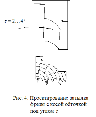 На рис. 3 показаны другие примеры видоизменения профиля детали. Если профиль детали односторонний, несимметричный с прямолинейными участками, перпендикулярными оси вращения фрезы (рис. 4), то цельную фрезу проектировать можно. В этом случае линии затылка зуба фрезы делаются не перпендикулярными оси вращения, а с косой обточкой t = 2...4°, что обеспечивает такой же задний угол для боковых режущих кромок. При последующих переточках профиль зуба смещается вправо, но сохраняется.