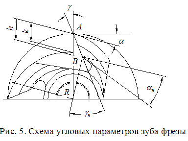 Полученное значение посадочного отверстия d округляют до нормализованного из ряда (ГОСТ 6636-74), мм: 22; 27; (30); 32; (35) ; 40; 50; 60; 70. Число зубьев фрезы Z = 2; 4; 6. Меньшее значение Z принимают при работе на станке с ручной подачей. Для станков с механической подачей Z = 4; 6. Выбор угловых параметров. Угловые параметры фрез приведены в табл. 1. У фасонной фрезы режущие кромки на передней грани АВ (рис. 5), формирующие высоту обрабатываемого профиля h, имеют различные радиусы вращения. Так для наружных точек А радиус вращения равен R, а для нижних точек В радиус вращения равен R - h. В связи с этим при переходе от точки А к точке В углы задний a и передний g увеличиваются до aн и gн. Они математически связаны следующими формулами: