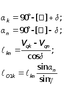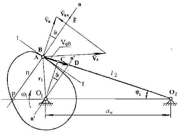 От полученных точек откладывают отрезки кинематических передаточных функций выбранном масштабе, соответственно перпендикулярно линии перемещения толкателя и вдоль толкателя. Длины отрезков, изображающих кинематические передаточные функции скорости толкателя , вычисляют по формуле