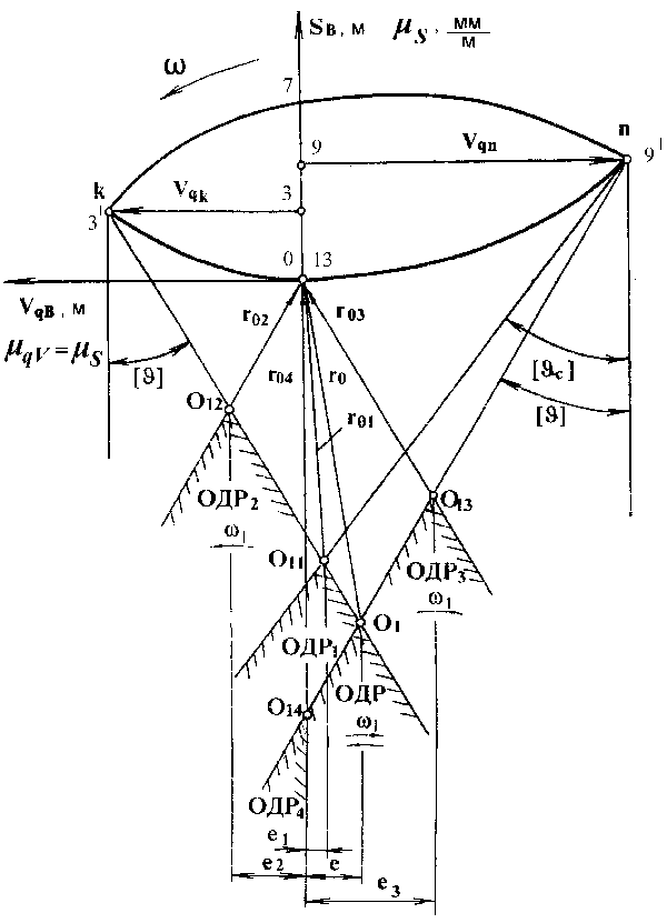 . Рис.12 Если реверсивное движение кулачка не предусмотрено и значения углов давления на фазе сближения не заданы, достаточно построить только одну ветвь фазового портрета, соответствующую удалению толкателя. Фазовый портрет для механизма с поступательно перемещающимся толкателем ограничивают в характерных точках лучами, которые проводят под заданными допустимыми углами давления к перпендикулярам, восстановленным в этих точках к векторам кинематических передаточных отношений.