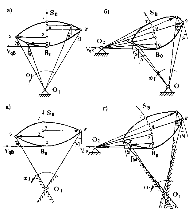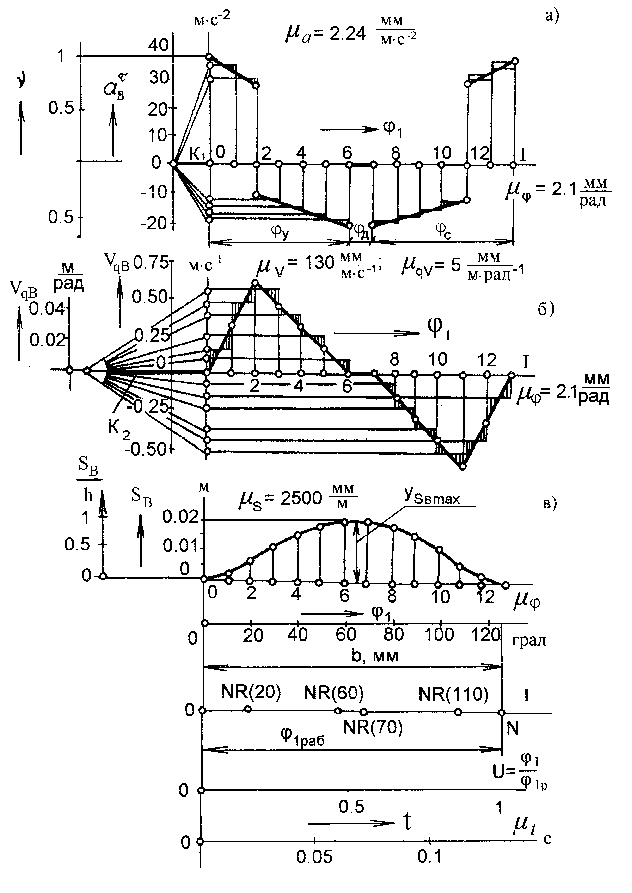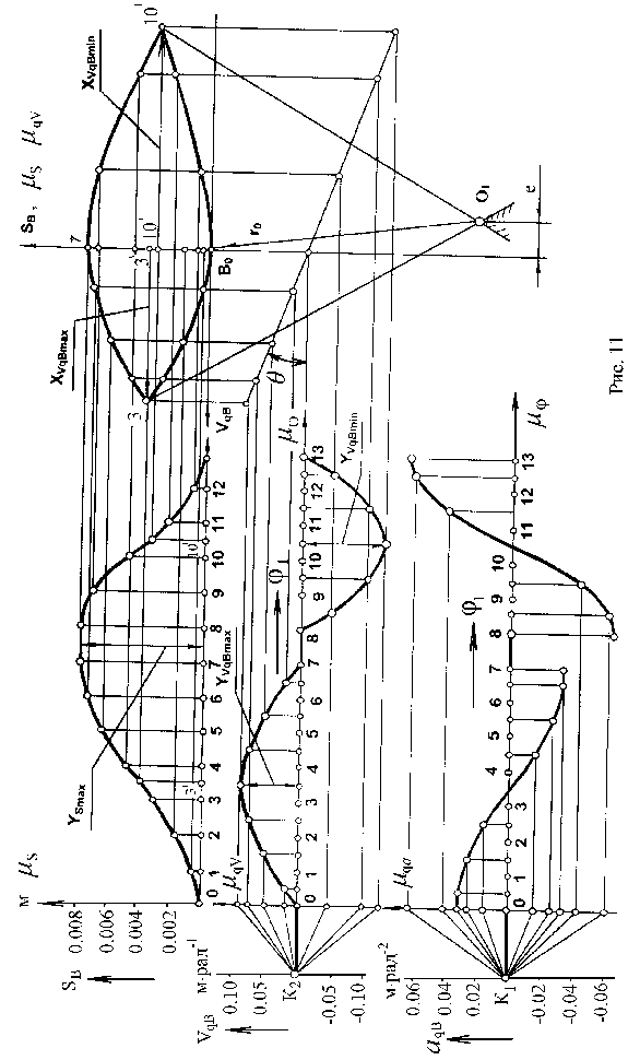 Фазовый портрет для механизма с поступательно движущимся толкателем можно построить и методом графического исключения параметра j1 из диаграмм SB(j1), VqB(j1). Для этого проводят вертикальную прямую - ось SB графика SB(VqB) (рис. 11б), продолжают ось j1 графика VqB(j1) до пересечения с осью SB, через полученную точку пересечения проводят прямую под углом q = arctg(mqv / ms) к горизонтали таким образом, чтобы при дальнейшем построении направление вектора передаточной функции соответствовало направлению вращения кулачка. Фазовый портрет строят по точкам. Для выбранной позиции проводят через точку графика VqB(j1) горизонталь до пересечения с прямой, проведенной под углом q, и через полученную точку - вертикаль. Через точку графика SB(j1) в той же позиции проводят горизонтальную прямую до пересечения с построенной вертикалью. Точка пересечения - точка графика SB(VqB) в выбранной позиции. Аналогично получают все остальные точки графика, которые соединяют плавной кривой.
