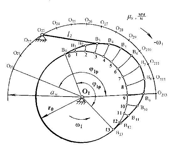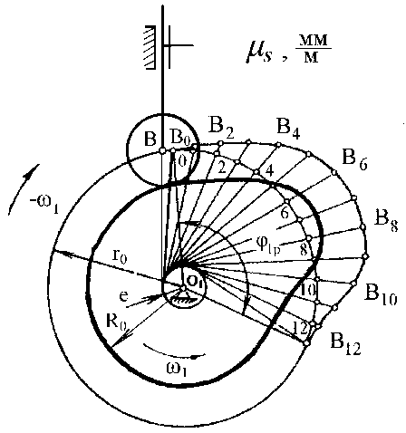 3. Построение профиля кулачка. При графическом построении профиля кулачка применяют метод обращения движения: всем звеньям механизма условно сообщают угловую скорость, равную - w1. При этом кулачок становится неподвижным, а остальные звенья вращаются с угловой скоростью, равной, но противоположной по направлению угловой скорости кулачка.