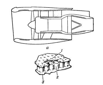 – мотогондола с ЗПК; б – многослойная звукопоглощающая конструкция; Рис. 2 1. ОПИСАНИЕ КОНСТРУКЦИИ МОТОГОНДОЛЫ На самолете установлены мотогондолы с использованием в конструкции композиционных материалов (звукопоглощающие панели воздухозаборника). Мотогондола (рис. 3) состоит из: – передней части воздухозаборника; – задней части (створки мотогондолы); – панелей крепления створок мотогондолы. Передняя часть мотогондолы состоит из носка, канала и обечайки. Носок крепится по внутреннему контуру к каналу воздухозаборника, а по внешнему – к обечайке. Канал – трехслойная оболочка. Внутренняя обшивка (перфорированная) выполнена из алюминиевого сплава Д19чАТВ толщиной 1,8 мм, нагруженная обшивка – из сплава Д19чАТ = 1,2 мм. Заполнитель: ТССП-Ф-10П, сотовый, с шестигранной ячейкой а = 10 мм. Толщина панели – 20 мм. Внешняя поверхность воздухозаборника – обечайка представляет собой клепанную оболочку с обшивкой из материала Д16-АТВ (травленая) с толщиной обшивки 1,8 мм, под двумя подкрепляющими до толщины равной 1,2 мм между ними. Обшивка в обечайке в передней плоскости крепится к стеночному шпангоуту передней губы воздухозаборника, а по задней – к торцевому стеночному шпангоуту в районе фланца двигателя. Воздухозаборник закреплен на переднем фланце двигателя двенадцатью быстросъемными соединителями (накидными болтами М10), воспринимающими осевые усилия, а также моменты вертикальных и горизонтальных осей. Силовое воздействие в плоскости, определяемой указанными осями, воспринимается цилиндрическим пояском на фланце двигателя, по которому осуществляется и центровка воздухозаборника. В конструкцию воздухозаборника встроена противообледенительная система (ПОС) с отбором горячего воздуха от третьей ступени компрессора высокого давления двигателя. Внешняя обшивка и панели объединены первым и четвертым силовыми шпангоутами. Четвертый шпангоут воздухозаборника выполняет функции поперечной противопожарной перегородки. Носок воздухозаборника отштамованный из нержавеющей стали состоит из четырех частей, сваренных между собой встык. Носок воздухозаборника состоит из обшивки, поперечной диафрагмы, на которой крепится коллектор с частью трубы ПОС и шпангоута № 1. Шпангоут № 1 сборной конструкции имеет кольцевую форму и состоит из стенки, усиленной поясами и диафрагмами. Коллектор входит в конструкцию противообледенительной системы воздухозаборника (ПОС). Звукопоглощающая канальная панель (ЗПК) конструктивно выполнена в виде двух дюралюминиевых обшивок, между которыми вклеен сотовый заполнитель. Со стороны проточной части обшивка перфорирована. ПО торцам панели приклеены профили для стыковки с носком по шпангоуту № 1 и со шпангоутом № 4 воздухозаборника. 2. СИЛОВОЙ РАСЧЕТ ВОЗДУХОЗАБОРНИКА В конструкциях современных самолетов можно наблюдать большое разнообразие типов, форм и расположений воздухозаборников. Это связано с тем, что они должны обеспечивать наиболее эффективное использование кинетической энергии набегающего потока и вместе с тем иметь минимальное лобовое сопротивление. Форма внутреннего канала должна обеспечивать возможно малые потери энергии на трение, но одновременно отвечать условиям лучшей компоновки самолета. В случае отсутствия аэродинамических продувок по воздухозаборникам нагрузки на них можно при