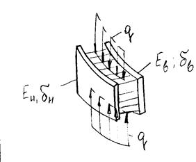 Рис. 25 qв = q(1/(1 + d)); qн = q(q/(1 + d)); d = l·(dн/dв) , l = E1н/Е1в = 6,8·105/6,8·105 = 1 , q = 8157/(p·140,5) = 18,48 (кг/см2), d = 1·(1,2/1,5) = 0,8 , qв = 18,48(1/(1 + 0,8)) = 10,27 (кг/см) [s02] = 27,5 (кг/мм2). qн = 18,48(0,8/1,8) = 8,21 (кг/см), sвн = 1027/0,15 = 68,5 (кг/см2), sн = 8,21/0,12 = 68,42 (кг/см2) . Избыток прочности: h = 27,5/0,685 - 1 = >> 39,14 . 2.7.4. Проверка прочности внутреннего канала на внешнее давление Расчетные нагрузки: 1. Установившийся режим Н = 0; М = 0; Разрежение на входе в заборник распространяется на всю длину канала: DpD = -0,645 кг/см2 ; dст.соты = 0,04 ; sм = 2400 кг/см2 ; sxz = 83 кг/см2 ; Gyz = 55,42 кг/см2 ; Gзап = Ö35,4·83 = 67,8 кг/см2 . Определяем Ркр для несимметричной трехслойной оболочки с мягким средним слоем (рис. 26)