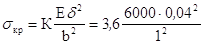 f = 0,866·1 = 0,866 см2. sсм = (0,357·0,866)/(1·0,04) = 8,12 (кг/см2), h = 34,56/8,11 – 1 = 3,26 Проверяем стенку ячейки на устойчивость от номинального давления в канале при М = 0,52 (Н = 0, DpD = 1,009 кг/см2). Давление передаваемое на заполнитель: Рзап = Р/(1 + d + x) = 1,009/1,80536 = 0,559 (кг/см2). sсм = (0,559·0,866)/(1·0,04) = 12,1 (кг/см2), h = 34,56/12,1 – 1 = 1,856. Определяем допустимый диаметр пятна непроклея по наружной обшивке. Рассмотрим работу квадратной пластинки на устойчивость (кромки оперты). a/b = 1, K = 3,6.