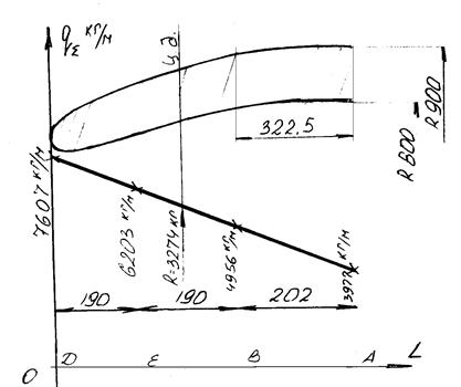 x = 0,1; 0,5·3448 + 2169 = 3893 кг/м; х = 0,153; 0,5·2659 + 1694 = 3024 кг/м. 2.6. Нагрузки на болты крепления воздухозаборника к проставке Воздухозаборник, соединенный болтами со средней частью гондолы двигателя, работает на изгиб по схеме консольной балки. 2.6.1. Определение нагрузок на болты крепления в случае А' Для определения нагрузок на болты крепления воздухозаборника к проставке примем: – число болтов n = 12; – Dокр. болтов = 1440 мм; Распределение суммарной погонной нагрузки в точках Д, С, В, А определяем как: qД = 3835 + 3777 = 7607 кг/м; qС = 3157 + 3046 = 6203 кг/м; qВ = 2526 + 2425 = 4951 кг/м; qА = 2000 + 1977 = 3977 кг/м. Распределение суммарной погонной нагрузки по длине представлено на рис. 17 Распределение суммарной погонной нагрузки по длине воздухозаборника Рис. 17 Величина суммарной приведенной нагрузки R в центре давления определяется как: R = ((7607 + 6703)/2 + (6203 + 4956)/2)·0,19 + ((4956 + 3977)/2)·0,202 = Для определения координаты центра давления определим суммарный изгибающий момент МА: МА = 6203·0,19·0,487 + 4956·0,19·0,297 + 3977·0,202·0,101 + 1404·0,19·0,5·0,518 + 1247·0,19·0.5·0,329 + 979·0,202·0,5·0,135 = 1056 кг·м. Координата центра давления хц.д.= 1056/3274 = 0,3225 м . Расчетные нагрузки на болты определяем по формулам [6]: Рmax = 4M/nDокр.б. , (1.9) Рmax = (4·0,3235·3274)/(12·1,44) = 245 кг . Срезающая нагрузка буртика (зуба) проставки: Рсрр = 3274 кг . Вес воздухозаборника Gв-ка = 93 кг, хц.т. = 350 мм вперед от плоскости крепления к проставке. Нагрузки на болты крепления воздухозаборника от инерционных нагрузок представлены на рис. 18.