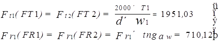 Диаметр шеек валов под подшипник назначают по каталогу на подшипник так, чтобы диаметр отверстия внутри кольца подшипника бал меньше диаметра ступеней вала под зубчатым колесом на 1...5 мм. При предварительном выборе подшипников качения целесообразно ориентироваться на следующие рекомендации: a) выходной вал устанавливают на шарико-радиальном однородном подшипнике. б) входной вал устанавливают на аналогичных подшипниках средней серии, как и промежуточный вал. Ведущий и промежуточный вал: N305 Ведомый вал : N207 Окончательные размеры валов устанавливаются в ходе эскизного проектирования по результатам расчетов валов на усталость и расчета подшипников по динамической грузоподь-емности. 7.1 Расчет усилий в зацеплении. Для удобства выполнения расчетов валов и подшипниковых узлов усилия, действующую в зоне контакта зубьев Fn представляют в виде составляющих, в общем случаи действующих по 3-м взаимно перпендикулярным направлениям : 1) по касательным к начальным окружностям - окружная сила Ft, 2) по радиусу - радиальная сила Fr, параллельно по оси зубчатых колес - осевая сила Fa.
