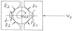 Из схемы видно, что под действием осевой силы заготовка переместится не сможет, т.к. имеется упор, т.е. Ро = Рос. Заготовка может только провернуться под действием момента кручения Мкр, поэтому необходимо приложить такое зажимное усилие, чтобы этого не произошло. Допустим, что при провертывании коэффициент трения будет f, а заготовка зажата в четырех призмах, условие равновесия будет выражено уравнением: KMрез – 4R1fr = 4R2fr = 0 где Rl = R2 = Waз / 2 ´ 1 / sina/2 следовательно, Мрез = 17,33Нм берем с самого