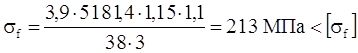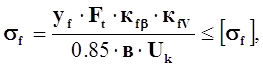 где σf – напряжение на изгиб у основания зуба; [σf]- допускаемое напряжение на изгиб, см. п. 4.4.2; кfv- коэффициент, учитывающий динамическую нагрузку, принимаем кfv=1.2 (табл. 1.10 [11]); кf β- коэффициент, учитывающий распределение нагрузки по ширине венца, принимаем кf β=1,2 (таблица 1.5 [11]); yf – коэффициент формы зуба, принимаем yf =4 [11].