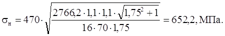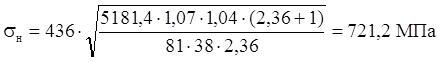где σн- расчетное контактное напряжение, МПа; [σн]- допускаемое контактное напряжение, МПа ([σн]=717,4 МПа см. п. 4.4.2); кнv- коэффициент, учитывающий динамическую нагрузку, принимаем кнv=1.04 (табл. 1.10 [11]); кнβ- коэффициент, учитывающий распределение нагрузки по ширине венца, принимаем кнβ=1,07 [11].