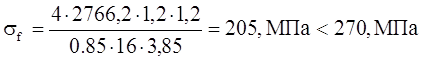 σн и [σн] приблизительно равны (перегрузка Δ=0,5%) что допускается. 4.5.6 Проверка зубьев на изгибную прочность где σf – расчетное напряжение на изгиб зубьев, МПа; [σf]- допускаемое напряжение на изгиб зубьев, [σf]=270 МПа см. п. 4.4.2; кfv- коэффициент, учитывающий динамическую нагрузку, принимаем кfv=1.1 (табл. 1.10 [11]); кf β- коэффициент, учитывающий распределение нагрузки по ширине венца, принимаем кf β=1,15 (таблица 1.5 [11]); yf – коэффициент учитывающий влияние формы зуба, принимаем yf =3,9 [11].