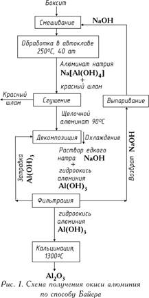 Сущность способа состоит в том, что алюминиевые растворы быстро разлагаются при введении в них гидроокиси алюминия, а оставшийся от разложения раствор после его выпаривания в условиях интенсивного перемешивания при 169-170оС может вновь растворять глинозем, содержащийся в бокситах. Этот способ состоит из следующих основных операций: 1). Подготовки боксита, заключающийся в его дроблении и измельчении в мельницах; в мельницы подают боксит, едкую щелочь и небольшое количество извести, которое улучшает выделение Al2O3; полученную пульпу подают на выщелачивание; 2). Выщелачивания боксита (в последнее время применяемые до сих пор блоки автоклав круглой формы частично заменены трубчатыми автоклавами, в которых при температурах 230-250°С (500-520 К) происходит выщелачивание), заключающегося в химическом его разложении от взаимодействия с водным раствором щелочи; гидраты окиси алюминия при взаимодействии со щелочью переходят в раствор в виде алюмината натрия: AlOOH+NaOH→NaAlO2+H2O или Al(OH)3+NaOH→NaAlO2+2H2O; содержащийся в боксите кремнезем взаимодействует со щелочью и переходит в раствор в виде силиката натрия: SiO2+2NaOH→Na2SiO3+H2O; в растворе алюминат натрия и силикат натрия образуют нерастворимый натриевый алюмосиликат; в нерастворимый остаток переходят окислы титана и железа, предающие остатку красный цвет; этот остаток называют красным шламом. По окончании растворения полученный алюминат натрия разбавляют водным раствором щелочи при одновременном понижении температуры на 100°С; 3). Отделения алюминатного раствора от красного шлама обычно осуществляемого путем промывки в специальных сгустителях; в результате этого красный шлам оседает, а алюминатный раствор сливают и затем фильтруют (осветляют). В ограниченных количествах шлам находит применение, например, как добавка к цементу. В зависимости от сорта бокситов на 1 т полученной окиси алюминия приходится 0,6-1,0 т красного шлама (сухого остатка); 4). Разложения алюминатного раствора. Его фильтруют и перекачивают в большие емкости с мешалками (декомпозеры). Из пересыщенного раствора при охлаждении на 60°С (330 К) и постоянном перемешивании извлекается гидроокись алюминия Al(OH)3. Так как этот процесс протекает медленно и неравномерно, а формирование и рост кристаллов гидроокиси алюминия имеют большое значение при ее дальнейшей обработке, в декомпозеры добавляют большое количество твердой гидроокиси — затравки: Na2OּAl2O3+4H2O→Al(OH)3+2NaOH; 5). Выделения гидроокиси алюминия и ее классификации; это происходит в гидроциклонах и вакуум-фильтрах, где от алюминатного раствора выделяют осадок, содержащий 50-60% частиц Al(OH). Значительную часть гидроокиси возвращают в процесс декомпозиции как затравочный материал, которая и остается в обороте в неизменных количествах. Остаток после промывки водой идет на кальцинацию; фильтрат также возвращается в оборот (после концентрации в выпарных аппаратах — для выщелачивания новых бокситов); 6). Обезвоживания гидроокиси алюминия (кальцинации); это завершающая операция производства глинозема; ее осуществляют в трубчатых вращающихся печах, а в последнее время также в печах с турбулентным движением материала при температуре 1150-1300оС; сырая гидроокись алюминия, проходя через вращающуюся печь, высушивается и обезвоживается; при нагреве происходят последовательно следующие структурные превращ