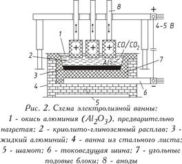 В окончательно прокаленном глиноземе содержится 30-50% α-Al2O3 (корунд), остальное γ-Al2O3. Этим способом извлекается 85-87% от всего получаемого глинозема. Полученная окись алюминия представляет собой прочное химическое соединение с температурой плавления 2050 оС. Получение алюминия из его окиси Электролиз окиси алюминия