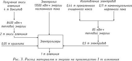а) самообжигающиеся аноды Зедерберга, состоящие из брикетов, так называемых «хлебов» массы Зедерберга (малозольный уголь с 25-35% каменноугольного пека), набитых в алюминиевую оболочку; под действием высокой температуры анодная масса обжигается (спекается); б) обожженные, или «непрерывные», аноды из больших угольных блоков (например, 1900×600×500 мм массой около 1,1 т). Сила тока на электролизерах составляет 150 000 А. Они включаются в сеть последовательно, т. е. получается система (серия) — длинный ряд электролизеров. Рабочее напряжение на ванне, составляющее 4-5 В, значительно выше напряжения, при котором происходит разложение окиси алюминия, поскольку в процессе работы неизбежны потери напряжения в различных частях системы. Баланс сырья и энергии при получении 1 т алюминия представлен на рис. 3. Электролиз хлорида алюминия (метод фирмы Алкоа)