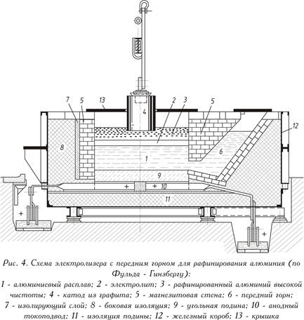 Получение рафинированного алюминия Для алюминия рафинирующий электролиз с разложением водных солевых растворов невозможен. Поскольку для некоторых целей степень очистки промышленного алюминия (Al 99,5 — Al 99,8), полученного электролизом криолитоглиноземного расплава, недостаточна, то из промышленного алюминия или отходов металла путем рафинирования получают еще более чистый алюминий (Al 99, 99 R). Наиболее известен метод рафинирования — трехслойный электролиз. Рафинирование методом трехслойного электролиза Одетая стальным листом, работающая на постоянном токе (представленная на рис. 4 — см. выше) ванна для рафинирования состоит из угольной подины с токоподводами и теплоизолирующей магнезитовой футеровки. В противоположность электролизу криолитоглиноземного расплава анодом здесь служит, как правило, расплавленный рафинируемый металл (нижний анодный слой). Электролит составляется из чистых фторидов или смеси хлорида бария и фторидов алюминия и натрия (средний слой). Алюминий, растворяющийся из анодного слоя в электролите, выделяется над электролитом (верхний катодный слой). Чистый металл служит катодом. Подвод тока к катодному слою осуществляется графитовым электродом. Ванна работает при 750-800°С, расход электроэнергии составляет 20 кВтּч на 1 кг чистого алюминия, т. е. несколько выше, чем при обычном электролизе алюминия. Металл анода содержит 25-35% Cu; 7-12% Zn; 6-9% Si; до 5% Fe и незначительное количество марганца, никеля, свинца и олова, остальное (40-55%) — алюминий. Все тяжелые металлы и кремний при рафинировании остаются в анодном слое. Наличие магния в электролите приводит к нежелательным изменениям состава электролита или к сильному его ошлакованию. Для очистки от магния шлаки, содержащие магний, обрабатывают флюсами или газообразным хлором. В результате рафинирования получают чистый алюминий (99,99%) и продукты сегрегации (зайгер-продукт), которые содержат тяжелые металлы и кремний и выделяются в виде щелочного раствора и кристаллического остатка. Щелочной раствор является отходом, а твердый остаток применяется для раскисления. Рафинированный алюминий имеет обычно следующий состав, %: Fe 0,0005-0,002; Si 0,002-0,005; Cu 0,0005-0,002; Zn 0,0005-0,002; Mg следы; Al остальное. Рафинированный алюминий перерабатывают в полуфабрикат в указанном составе или легируют магнием (см. табл. 1.2.). ТАБЛИЦА 1.2. Химический состав алюминия повышенной чистоты и первичного алюминия по DIN 17122, лист 1.