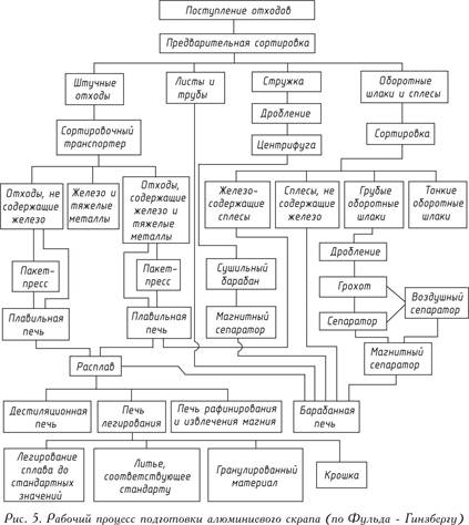 Безупречное приготовление алюминиевого скрапа в самых разнообразных пропорциях можно осуществлять только на специально оборудованных плавильных заводах. Представление о сложном рабочем процессе на таком заводе дает рис. 5. Отходы переплавляют после грубой предварительной сортировки. Содержащиеся в этих отходах железо, никель или медь, точка плавления которых выше точки плавления алюминия, при плавке в плавильной пороговой печи остаются в ней, а алюминий выплавляется. Для удаления из отходов неметаллических включений типа окислов, нитридов, карбидов или газов применяют обработку расплавленного металла солями или (что рациональней) продувку газом — хлором или азотом. Для удаления металлических примесей из расплава известны различные методы, например присадка магния и вакуумирование — метод Бекша (Becksche); присадка цинка или ртути с последующим вакуумированием — субгалогенный метод. Удаление магния ограничивается введением в расплавленный металл хлора. Путем введения добавок, точно определяемых составом расплава, получают заданный литейный сплав. Производство алюминия технической чистоты Электролитический способ — единственный применяющийся во всем мире для производства металлического алюминия технической чистоты. Все другие способы (цинкотермический, карбидотермический, субхлоридный, нитридный и др.), с помощью которых алюминий может быть извлечен из алюминиевых руд, разрабатывались в лабораторном и опытно-промышленных масштабах, однако пока не нашли практического применения. Для получения алюминиево-кремниевых сплавов успешно применяется электротермический способ, впервые разработанный и осуществленный в промышленном масштабе в СССР. Он состоит из двух стадий: на первой стадии получают первичный алюминиево-кремниевый сплав с содержанием 60-63 % Al путем прямого восстановления алюмо-кремнистых руд в рудно-термических электрических печах; на второй стадии первичный сплав разбавляют техническим алюминием, получая силумин и другие литейные и деформируемые алюминиево-кремниевые сплавы. Ведутся исследования по извлечению из первичного сплава алюминия технической чистоты. В целом получение алюминия электролитическим способом включает в себя производство глинозема (окиси алюминия) из алюминиевых руд, производство фтористых солей (криолита, фтористого алюминия и фтористого натрия), производство углеродистой анодной массы, обожженных угольных анодных и катодных блоков и других футеровочных материалов, а также собственно электролитическое производство алюминия, которое является завершающим этапом современной металлургии алюминия. Характерным для производства глинозема, фтористых солей и углеродистых изделий является требование максимальной степени чистоты этих материалов, так как в криолитоглиноземных расплавах, подвергающихся электролизу, не должны содержаться примеси элементов, более электроположительных, чем алюминий, которые, выделяясь на катоде в первую очередь, загрязняли бы металл. В глиноземе марок Г-00, Г-0 и Г-1, которые преимущественно используются при электролизе, содержание SiO2 составляет 0,02-0,05%, a Fe2O3 — 0,03-0,05%. В криолите в среднем содержится 0,36-0,38% SiO2 и 0,05-0,06% Fe2O3, во фтористом алюминии 0,30-0,35% (SiO2 + Fe2O3). В анодной массе содержится не более 0,25% SiO2 и 0,20% Fe2O3. Важнейшая алюминиевая руда, из котор