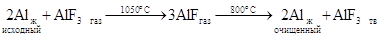В табл. 1.5 (см. ниже) приведены результаты масс-спектрального анализа и измерения R293 К/R4,2 К алюминия, полученного каскадной зонной плавкой. Из приведенных данных можно сделать заключение, что чистота такого алюминия, определенная по разности с десятью основными примесями (Si, Fe, Mg, Mn, Ti, Cu, Cr, Zn, Na, и V), составляет >99,9999%. Этот вывод косвенно подтверждается величиной R293 К/R4,2 К, которая во всех образцах составляла >30ּ103. Для получения металла чистотой 99,9999% достаточно провести два каскада зонной плавки (см. табл. 1.5). Дальнейшее увеличение числа каскадов не повышает чистоту алюминия, хотя и увеличивает общий выход металла чистотой 99,9999%. Другим возможным процессом для получения алюминия особой чистоты является его дистилляция через субгалогениды, в частности через субфторид алюминия. Давление насыщенных паров металлического алюминия недостаточно высоко, чтобы осуществить его непосредственную дистилляцию с практически приемлемыми скоростями. Однако при нагревании в вакууме (при 1000-1050°С) с AlF3 алюминий образует легколетучий субфторид AlF, который перегоняется в холодную зону (800°С), где вновь распадается (диспропорционирует) с выделением чистого алюминия:
