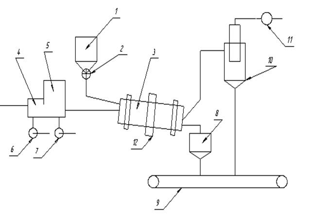 II. Барабанная сушилка. Она представляет собой сварной цилиндр – барабан, на наружной поверхности которого укреплены бандажные опоры, кольца жесткости и приводной зубчатый венец; Ось барабана может быть наклонена к горизонту на 4о - 6о Барабанные атмосферные сушилки непрерывного действия предназначены для сушки сыпучих материалов топочными газами или нагретым воздухом. Внутри барабана устанавливают насадки, конструкция которых зависит от свойств высушиваемого материала. Со стороны загрузочной камеры многозапорная винтовая насадка, с числом спиральных лопастей от шести до шестнадцати в зависимости от диаметра барабана. При сушке материала с большой адгезией к поверхности на начальном участке последнего закрепляют цепи, при помощи которых разрушают камки и очищают стенки барабана. Для этой же цели могут применять ударные приспособления, расположенные с внешней стороны барабана. В сушилках диаметром 1000 – 1600 мм для материала с хорошей сыпучестью и средним размером частиц до 8 мм устанавливают секторную насадку. В тех же сушилках, для материалов, обладающих повышенной адгезией или сыпучих материалов со средним размером частиц более 8 мм устанавливают подъемно – лопастные устройства. В сушилках диаметром 1000 – 3500 мм для материалов склонных к налипанию, но восстанавливающих сыпучие свойства в процессе сушки сначала устанавливают подъемно – лопастные перевалочные устройства, а затем секторные насадки. Основной материал для изготовления барабанов сушилок, загрузочных и разгрузочных камер – углеродистые стали. В технически обоснованных случаях дополнительное изготовление барабанов, разгрузочных и разгрузочных камер частично или полностью из жаростойких сталей специальных марок. Барабанные вакуумные сушилки работают, как правило, периодически и их применяют для сушки термочувствительных материалов от воды и органических растворителей, а также для сушки токсичных материалов. В зависимости от свойств материала и требований к готовой продукции применяют сушилки среднего или глубокого вакуума. Вакуумные барабанные сушилки применяют в основном в производстве полимерных материалов. III. Принципиальная схема барабанной сушилки