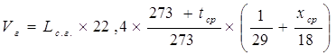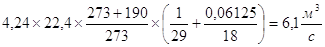 Количество тепла QV, выделяющееся при сжигании 1 м3 газа равно: Qν = ∑ φi ∙ Hi = 0,98∙35741 + 0,01∙63797 + 0,002∙91321 + 0,003∙118736 + 0,002∙12680 +0,003∙10810= 36260,79 (кДж/кг), где φi – объемная доля компонентов газа; Hi – тепловой эффект реакции (кДж/м3). Плотность газообразного топлива: ρt = (∑CmHn∙Mi / V0)∙(Т0 / Т0+tт), (2) где Mi - мольная масса топлива (кмоль/кг); tт – температура топлива; tт = 20 0 C V0 – мольный объем; V0 = 22.4 м3/кмоль Т0 = 273 0 К. ρт = (0,98∙16 + 0,01∙30 + 0,002∙44 + 0,003∙58)∙273 / 22,4∙(273 + 20) = 0,6756 кг/м3 Количество тепла выделяющееся при сжигании 1 кг топлива равно: Q = Qν / ρт = 36260/0,6756 = 53671,98 Дж∙м3 Масса сухого газа, подаваемого в сушильный барабан, в расчете на 1 кг сжигаемого топлива определяется общим коэффициентом избытка воздуха α, необходимого для сжигания топлива и разбавления топочных газов, до температуры смеси. tсм = 300 0 C Значение α находят из уравнений материального и теплового баланса. – Уравнение материального баланса: 1 + L0 = Lс.г + ∑9n/(12m+n)CmHn, (4) где Lс.г. – масса сухих газов образовавшихся при сгорании 1 кг топлива; CmHn – массовая доля компонентов, при сгорании которых образуется вода (кг/кг). – Уравнение теплового баланса: Q∙η + cт∙tт + α∙L0∙I0 = [ Lс.г.+ L0(α – 1)]∙iс.г.+ [α∙L0∙х0 + ∑9n/(12m+n)CmHn], (5) где η – общий КПД учитывающий эффективность работы топки и потери тепла топкой в окружающую среду; η = 0,95; ст – теплоемкость газообразного топлива при температуре топлива 200 С; ст = 1,34 кДж/(кг∙к); I0 – энтальпия свежего воздуха ( кДж/кг); I0 = 49 кДж/кг; iс.г. – энтальпия сухих газов; iс.г. = сс.г.∙tc.г. = 1,05∙300 = 315 (кДж/кг), где сс.г. = 1,05 кДж/(кг∙К) tс.г. = 300 0С; x0 – влагосодержание свежего воздуха при температуре t0 = 200С и влажности φ0 = 70 %, х0 = 0,0125 кг/кг iп = r0 + сntn = 2500 + 1,97∙300 = 3091 (кДж/кг) где r0 – теплота испарения воды при температуре 0 0С r0 = 2500 кДж/кг сп – средняя теплоемкость водяных паров, сп=1,97 кДж/(кг∙К); tп – температура водяных паров tп = tс.г. = tсм. = 300 0C Решая совместно уравнения 4 и 5, получаем: α = [Qп∙η+cт∙tт−iс.г.(1−∑9n/(12m+n)CmHn)−iп∑9n/(12m+n)CmHn]/L0∙(iс.г.+iп∙x0−I0) (6) Пересчитаем содержание компонентов